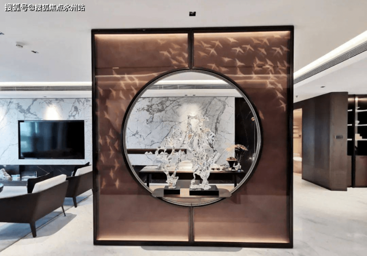 这个建面约321㎡的样板间,做了一道圆形镂空的屏障作为入户玄关过渡。