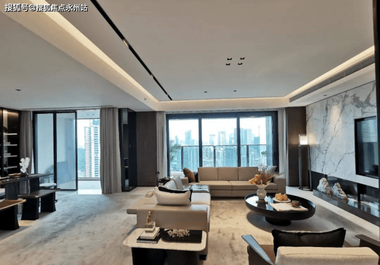 特别是玻璃幕墙上又饰以白色大理石质感的线条,有规律地拼接成水波纹形状的侧面,给天空留下了别样的天际线。这种独有的豪宅质感一下子就扑面而来。