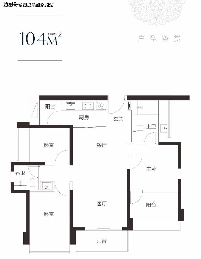 建面约104平三房两卫,双龙抱珠房型设计,客厅出阳台,明亮开阔。超大主卧套房,居住舒适度高,自带卫生间,尊享私密品质生活体验;两个次卧都有飘窗,空间开阔。