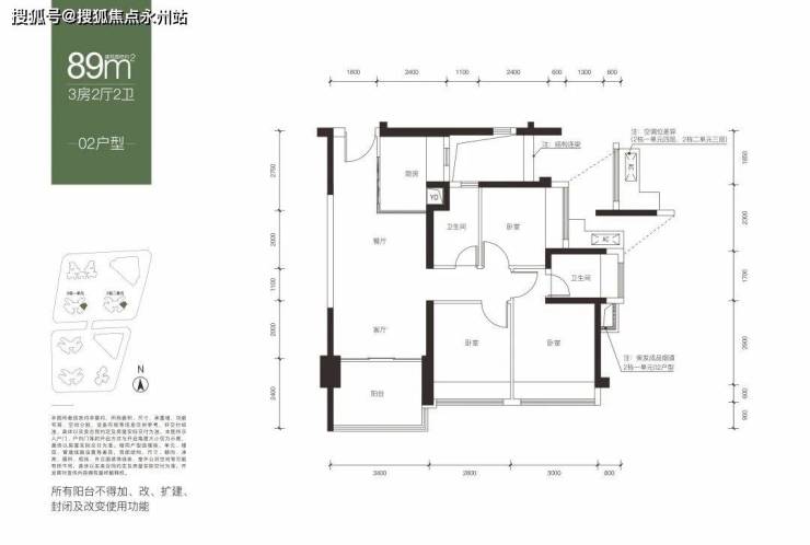 89㎡的3房2厅2卫户型,设计的是经典竖厅格局,客厅3.4米开间,三开间朝南,3个卧室分别是3米/2.8米/2.4米的宽度,L型厨房,得房率:87.88%(包含赠送),02-03户型是东南朝向,05.06户型是西南朝向。
