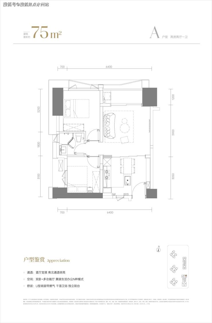 75㎡大两房,南北通透,双阳台设计(景观阳台+生活阳台),客厅开间4.2米,主卧套房设计(含独立卫浴+衣帽间)。