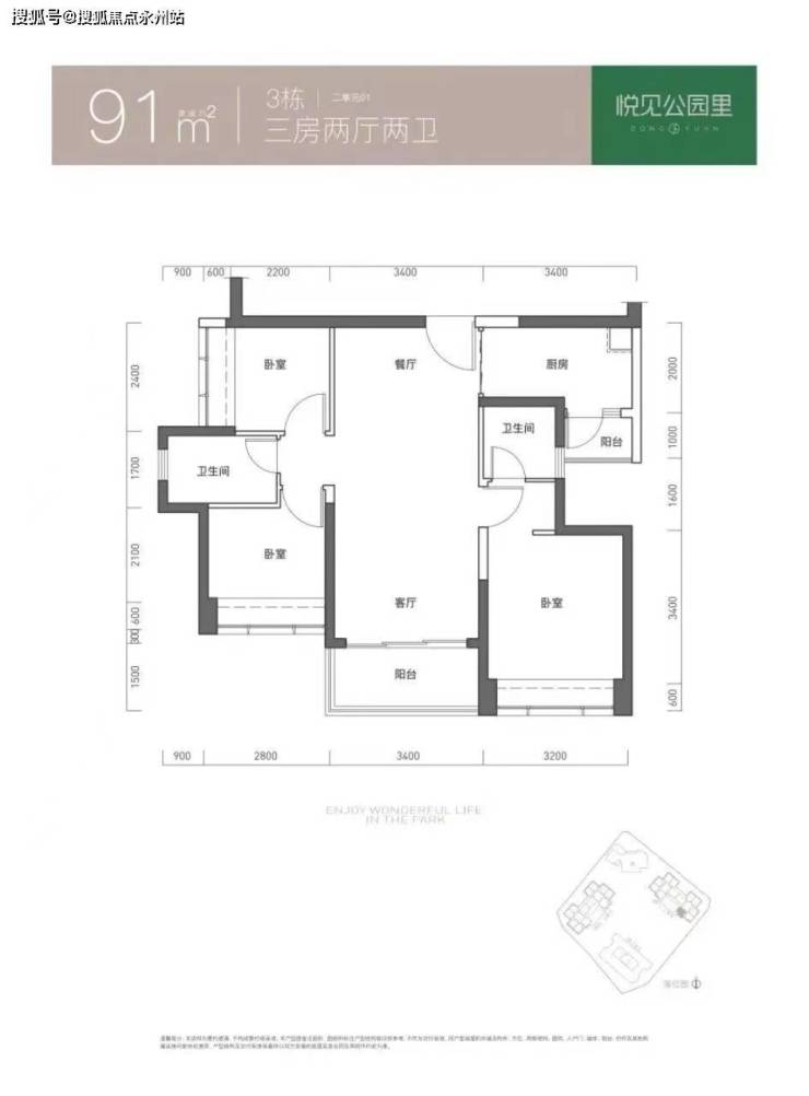 91㎡的3房2厅2卫,仅3栋2单元01户型,设计的是竖厅双龙抱珠格局,客厅3.4米开间,三开间朝南,3个卧室分别做到了3.2米/2.8米/2.4米的宽度,L型厨房带1个生活阳台,卫生间干湿分离,得房率73.55%(不含赠送),西南朝向。