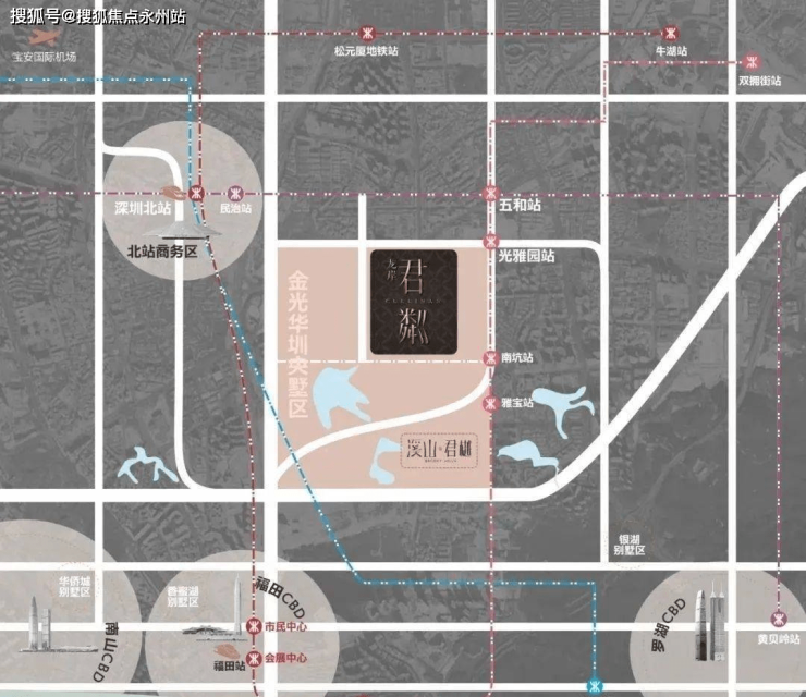 龙岸君粼位于龙华民治布龙公路南侧梅观高速公路东侧,紧邻地铁10号线光雅园站约200米,项目共分为三期开发,主要以临湖别墅、半山叠墅、高层住宅和风情商业街多种业态组成的低密度湖山别墅与叠墅的住区,花园拥有5300㎡的龙栖湖景观和滨水木栈道环绕内湖。