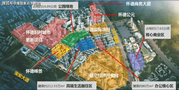 其中,生活居住区总建面约212.6万㎡,办公核心区建面约80万㎡,核心商业区占地约17.63万。包括有已经建成的怀德公园、怀德城峰境、怀德商务大厦、怀德国际,及建设的航港国际商务综合体、怀德旧村改造等大型项目。