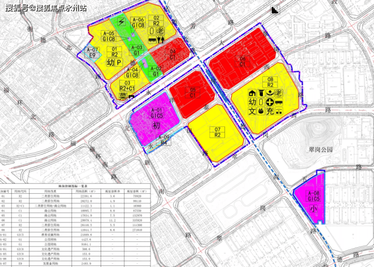 区域一(01~04地块、A-02~A-07等地块):包括一所4层12班幼儿园、12栋19~21层住宅楼、1栋8层住宅楼、1栋18层建筑(酒店+商业+公寓)、各类商业配套以及公园绿地、文化遗产用地等。(尚在规划阶段)