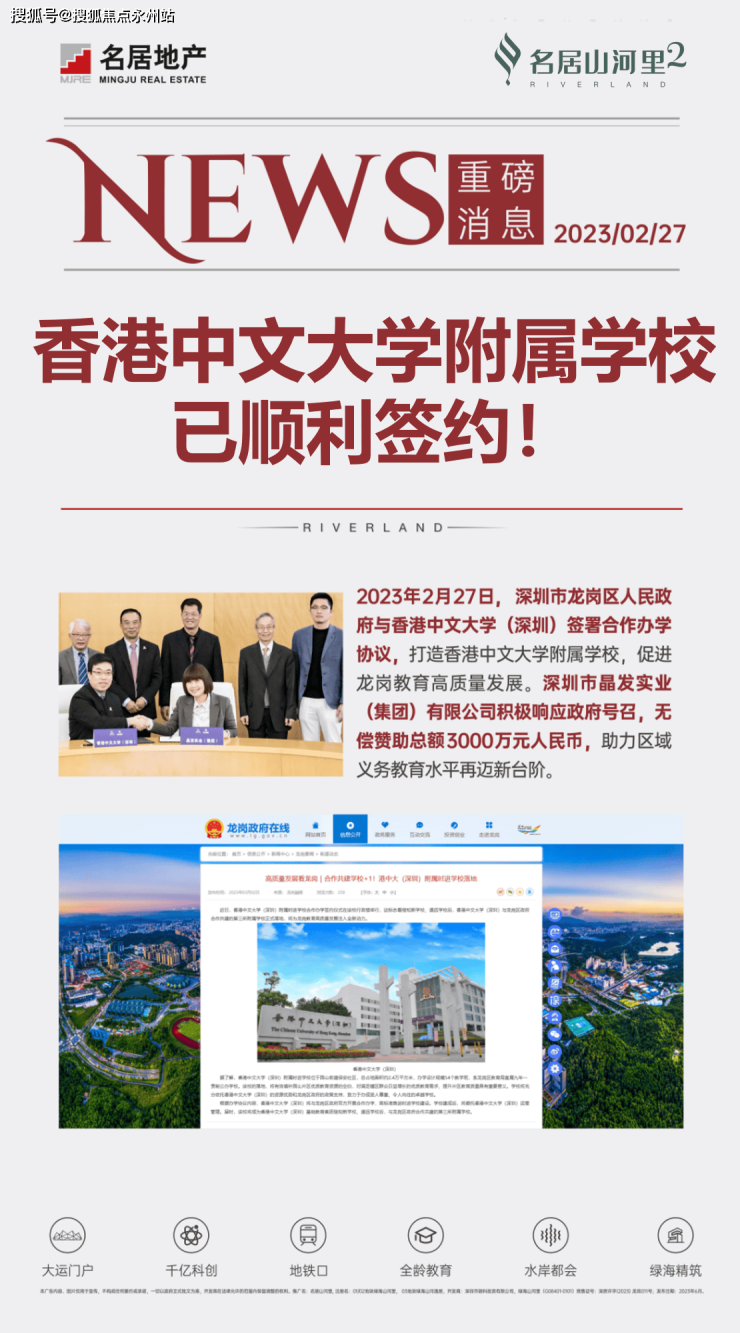 2023年2月27日,香港中文大学(深圳)与龙岗区人民政府签署了办学协议,学校建成后将由香港中文大学(深圳)负责运营管理。名居山河里的居民将享受到家门口的优质教育资源,包括项目自建的幼儿园和与龙岗区政府合作的香港中文大学(深圳)附属时进学校,这是该教育集团在龙岗区继道远学校、知新学校之后共建的第三所学校。