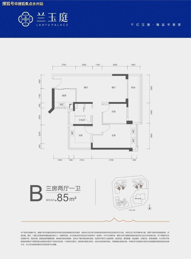 B 户型(85㎡):升级设计,创新式三分离卫生间,提高早晚使用效率;次卧面宽调整为2.7米,空间更灵活。