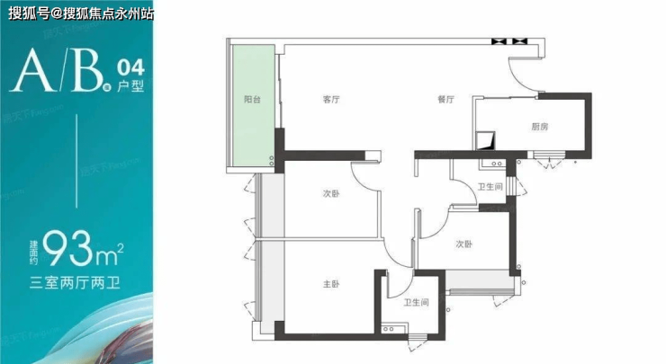 A/B座04户型—建面约93m2 三房两厅两卫