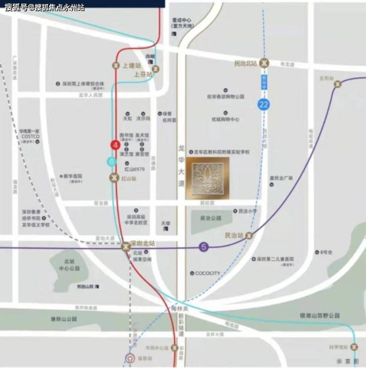 地铁:4、6号线,红山站约1.3公里。1站直达深圳北站。4站到福田。5号线,民治站约1.4公里。22号线(规划中)四轨交汇环绕。