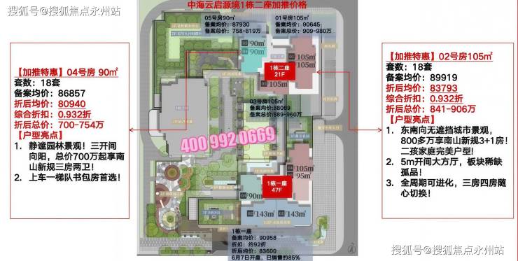 第二次加推:2025年8月2日,加推1栋2单元02、04户型,共36套90-105㎡,开盘优惠0.932折,折后均价8.26万,总价700-906万。
