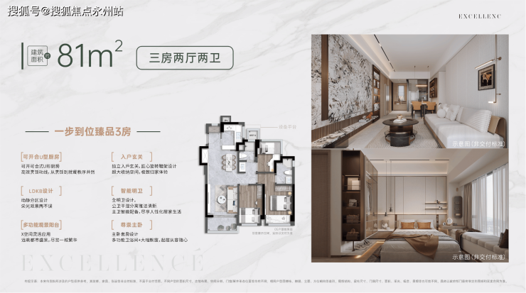 81㎡三房两厅两卫:竖厅格局延伸至阳台,形成约30㎡公共活动空间,满足家庭聚会与儿童活动需求,