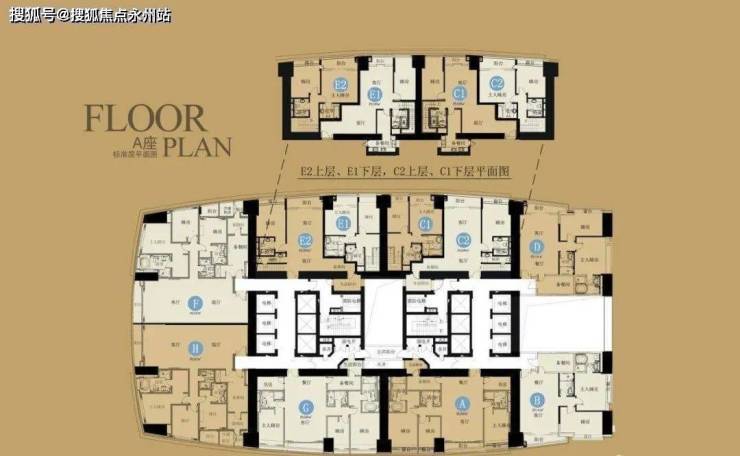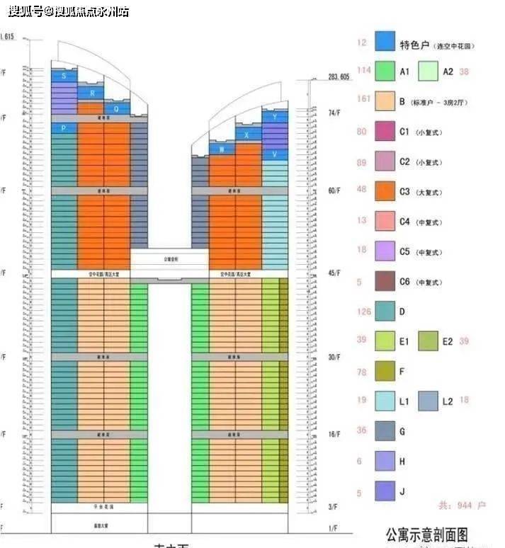 两座公寓最高层单位分别A座82层308 米、B座75层 275 米,是亚洲第一高纯公寓。