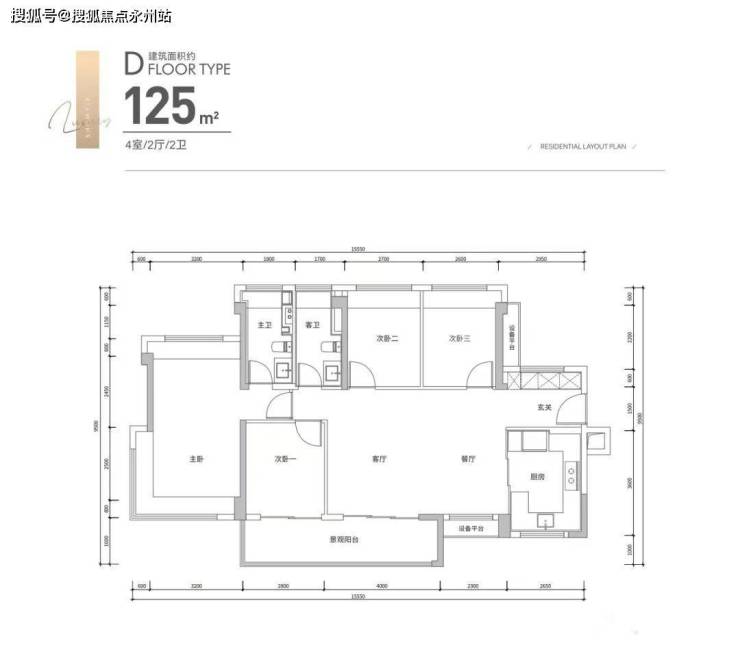 125㎡横厅四房两厅两卫,基本是111㎡放大版,主朝向西南,主卧做了三面采光,除了能改衣帽间外,空间尺度采光都非常足。