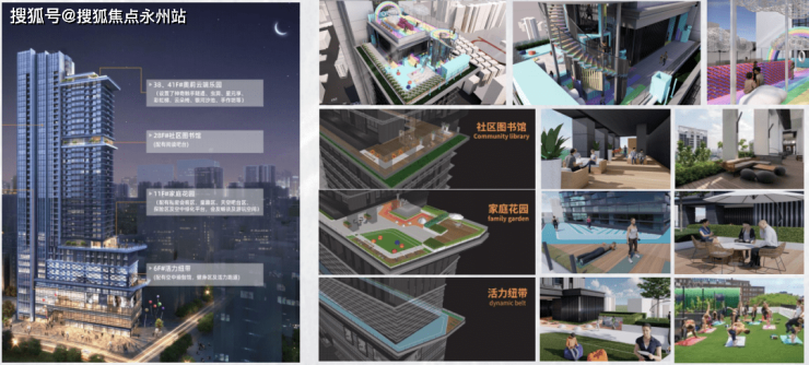 以垂直社区场景设计,利用体育活动场地、避难层等公共空间,增设文化活动中心、家庭花园及社区图书馆。