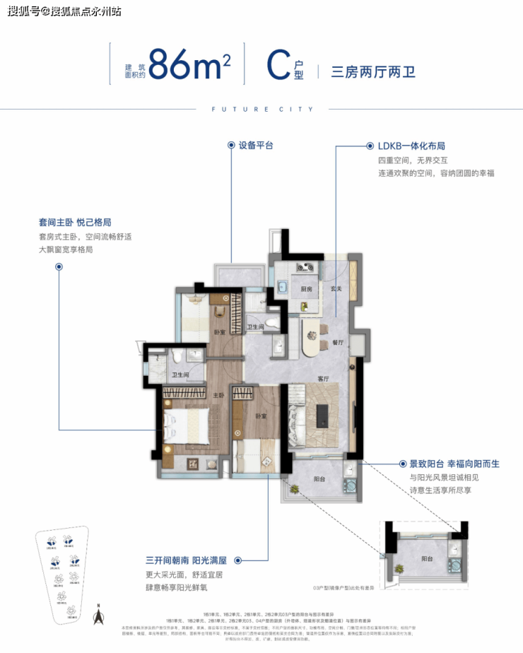 86㎡3房2厅2卫:也是竖厅设计, 进门入户玄关,S墙设计预留冰箱位,U型厨房,餐客厅一体连接阳台,公卫三段式分离,不同的是,三开间朝南,阳台是东南或西南朝向。