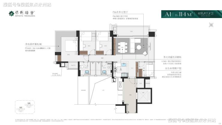 保利瑧誉府,项目为宝安首个「新规盘」,通过优化设计实现得房率显著提升。以123㎡四房为例,套内面积96.06㎡+赠送18.12㎡=实用面积114.18㎡,得房率约92.34%(不含私用公区);若计入专梯入户赠送的6-12㎡私用公区,实际使用率超100%,部分户型可达108%。主力户型采用纯南向板楼、四开间朝南、LDKB一体化设计,主卧配备270°无柱转角飘窗,兼顾空间感与景观资源。(深圳宝安保利瑧誉府售楼处电话:400-992-0669)