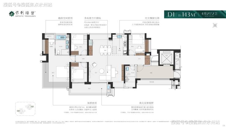 138-143㎡四房+1房两卫户型代表了项目的最高端产品,提供横厅和竖厅两种选择,满足不同家庭的空间需求。
