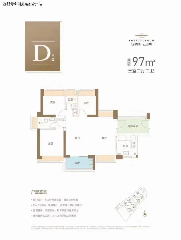 97㎡的3房2厅2卫,设计的横厅格局,有南北通透,东西通透两个朝向。