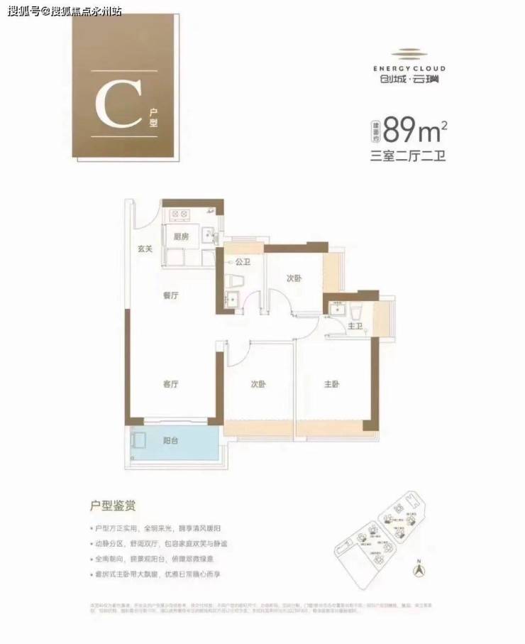 89㎡的3房2厅2卫,设计的经典竖厅格局,有南向,东南朝向。