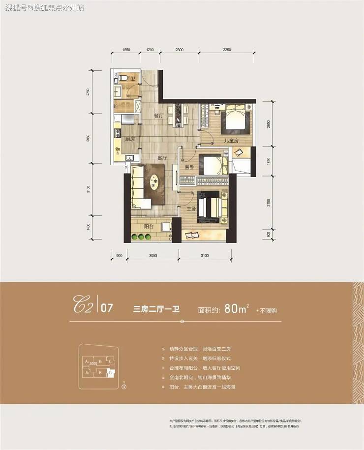 80㎡两居室(主力户型):经典两室两厅一卫设计,户型方正,南北通透,动静分区明确。客厅开间 3.8 米,与餐厅相连形成一体化公共空间,南向面海阳台引入180°大鹏湾景观,主卧配备270° 转角飘窗,次卧可灵活改造为书房或儿童房,空间利用率达85%。