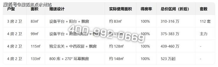 价格:备案均价4.26万/㎡,折后均价约3.87万/㎡,总价310万起(83㎡)