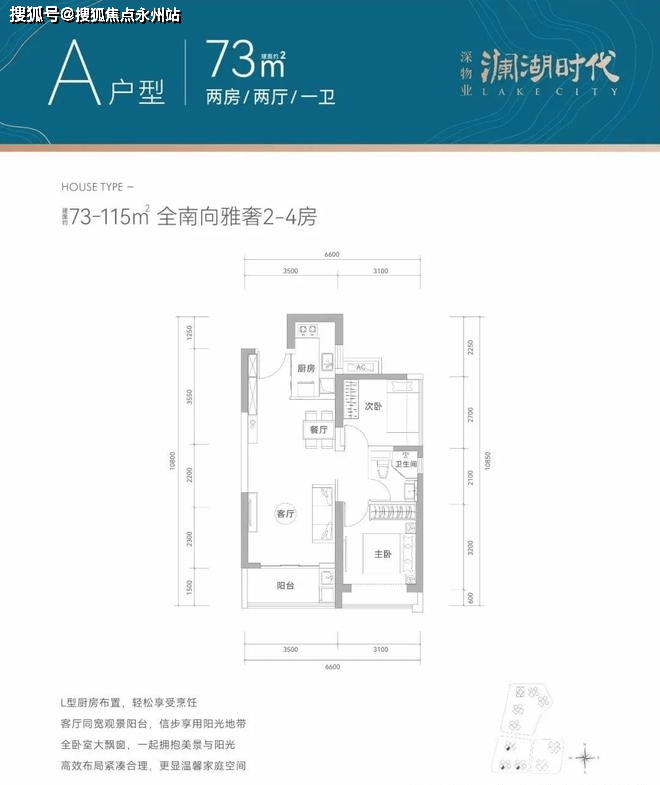 73㎡的2房2厅1卫,设计的竖厅格局,L型厨房,全卧室大飘窗,西南朝向。