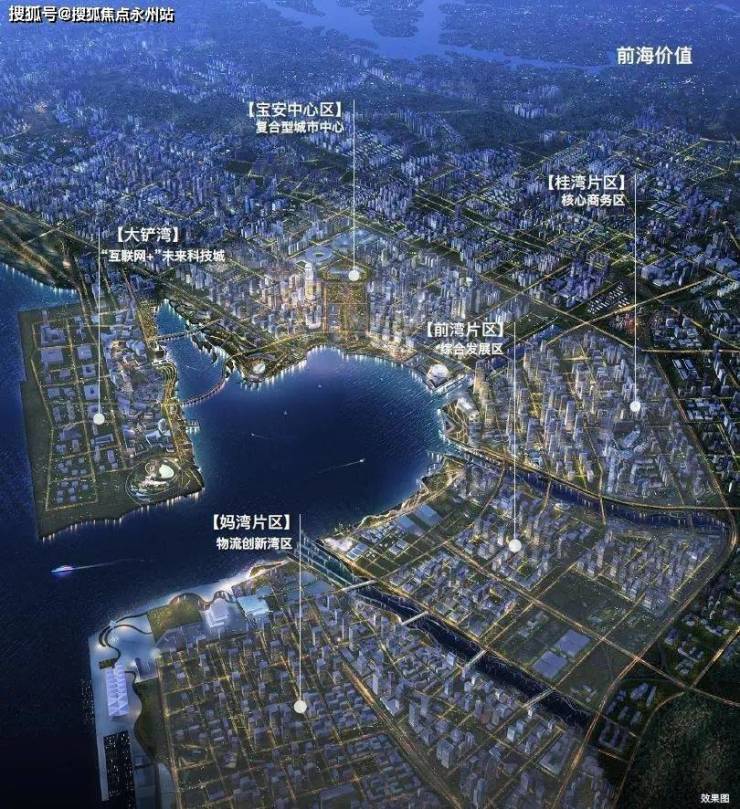 内湾由宝中、腾讯未来科技城(大铲湾)、妈湾、前湾、桂湾等片区环绕形成,为前海扩容后的核心组团,也是深圳西海岸上的湾区门户。