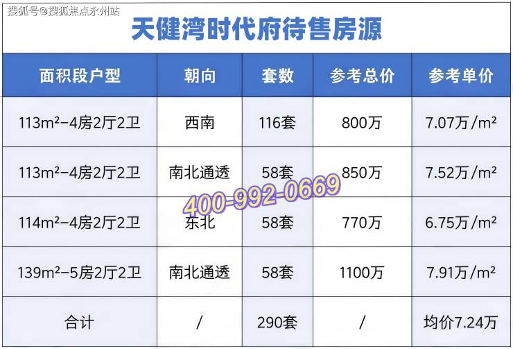 规划建设2栋 100 米内的31层住宅,共推出约290套房源,户型涵盖113㎡四房与139㎡五房,其中113㎡四房为绝对主力户型。户型朝向以朝南、西南为主,仅两套房源朝东北方向,可直面金众区域。(深圳南山天健湾时代府售楼处电话:400-992-0669)