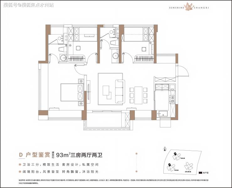 93㎡的3房2厅2卫,1/3栋的02户型,设计的是横厅南北通透格局,客餐厅5.8米开间,LDK一体化设计,3个卧室分别做到了3.2米/2.9米/2.5米的宽度,主卧270°转角飘窗,U型厨房,公卫三段式分离,得房率:76.44%(不含赠送),阳台主朝西南向。