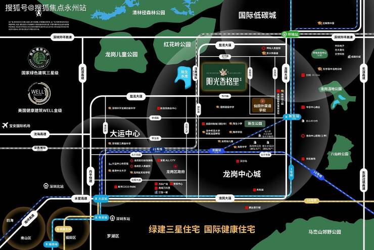 阳光香格里家园,是目前深圳唯一符合绿建三星及美国WELL金级双层标准的住宅小区,小区有8重园林景观及商业立面垂直绿化设计,社区打造了雾森系统、香氛系统、背景音乐系统、社区全龄段泛会所、国际标准泳池、夜光跑道、亲子菜园、童趣沙滩、隔音绿植、社区空气质量检测系统、社区水质监测系统、前置过滤系统、地下车库CO检测系统、加厚保护层钢筋等。