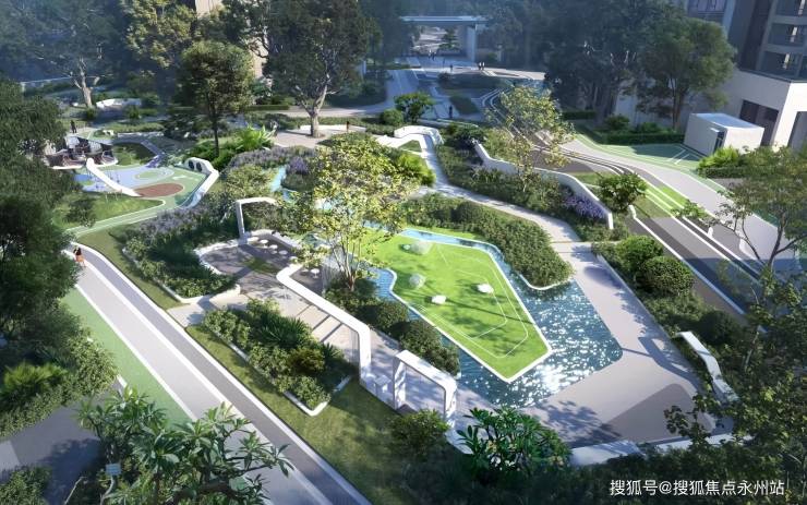 公园内包括:水域、湿地景观,亲水平台,音乐喷泉,廊桥,儿童活动场地,足球场,环湖步道。业主可以享受推窗即揽湖园双景的诗意生活,茶余饭后可到公园散步、跑步、遛娃,生活品质得到显著提升。