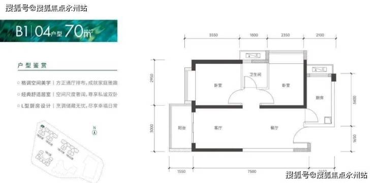 70㎡的2房2厅1卫,仅1栋B1座04户型,设计的是竖厅格局,客厅3米开间,餐客厅一体化设计,2个卧室分别做到了2.95米/2.35米的宽度,L型厨房,卫生间干湿分离,得房率:75.66%(不含赠送),阳台朝西北向。
