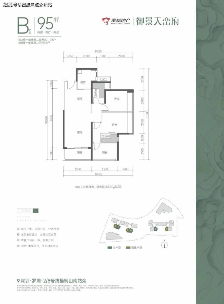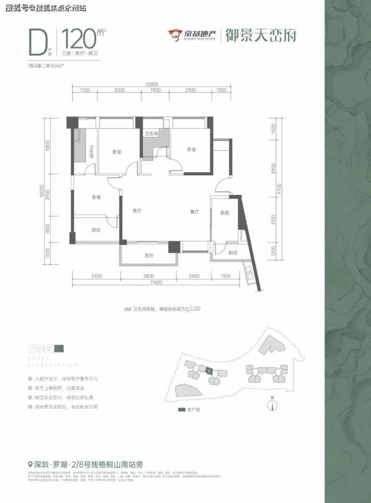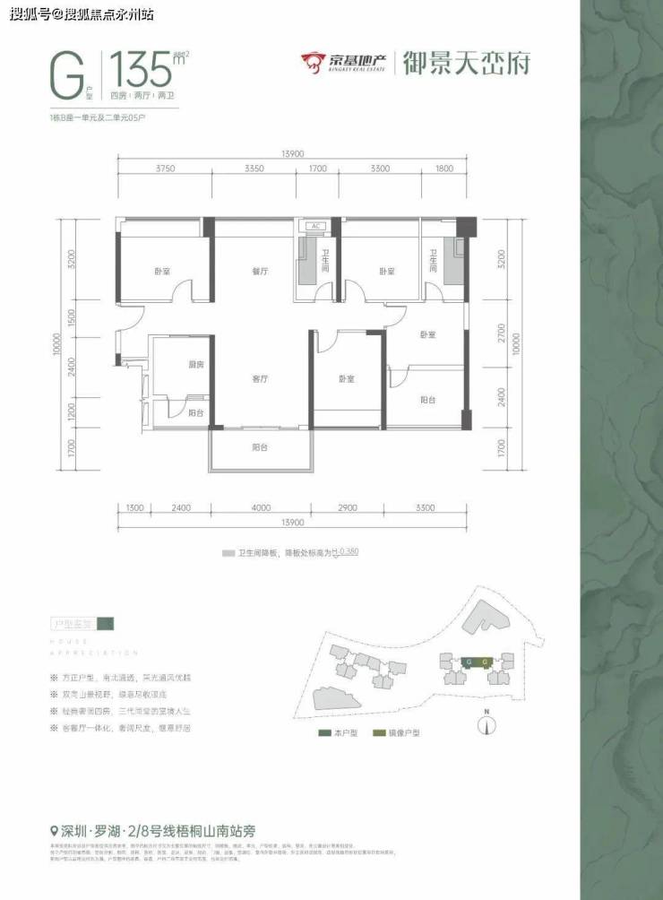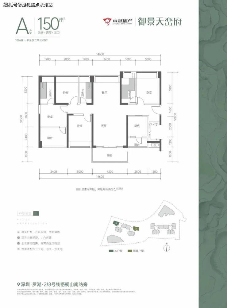 京基御景天峦府,位于深港融合中心深圳罗湖莲塘片区,兼具城市中心繁华与山海生态景观,距离地铁2号线/8号线梧桐山南站约500米。项目占地面积约1.4万㎡,总建筑面积约14万㎡,可售产品为建面约75-150㎡畔山雅著。