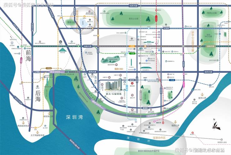 公园体系:300米石厦公园、600米皇岗公园、1.5公里红树林生态公园,形成三级生态网络。