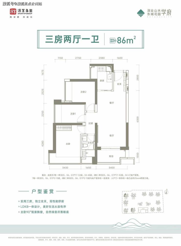 86㎡的3房2厅1卫,设计的是竖厅格局,进门入户玄关,客厅3.4米开间,LDKB一体化设计,3个卧室,L型厨房,卫生间干湿分离,西南、东南或西北向。