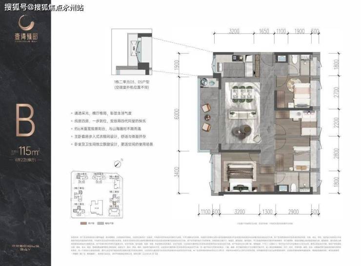 B户型:建面约115㎡,是独门独户、竖厅、半动静分区,带宽体阳台的四房两厅两卫,分布在1栋2单元和3栋1单元这两栋,有西南和东南两种朝向。户型跟98㎡相似度较高,只不过各功能间的开间要宽一些,公卫的位置会不一样,客厅背景墙后面会多一个卧室。