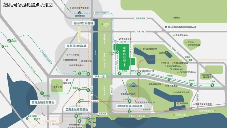 绿景白石洲位于深圳核心位置南山区的华侨城片区,深圳城市发展主轴——深南大道与大沙河创新走廊十字交汇点,依托华侨城人文艺术城区,链接后海总部基地、深圳湾超级总部基地、留仙洞总部基地、高新园总部基地四大总部基地。