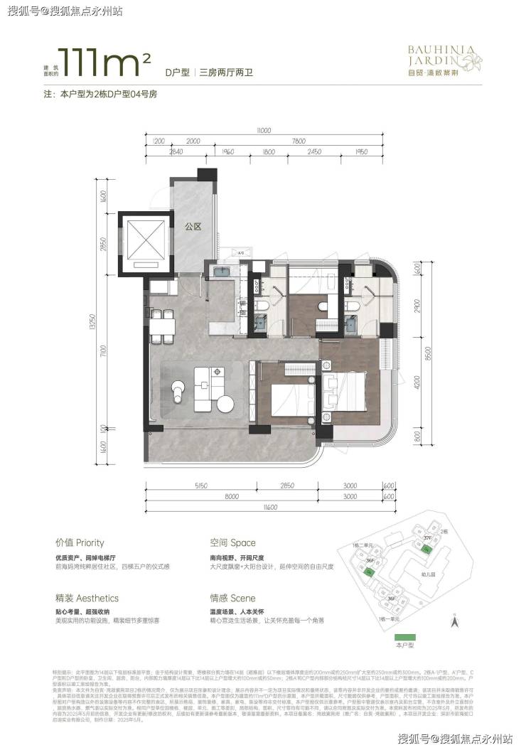 111㎡的3房2厅2卫,2栋05户型,设计的是竖厅格局,专梯入户有送约5.7㎡的独立公区,客厅5.15米开间,超宽客厅,LDKB一体化设计,动静分区,三开间朝南,主卧大套间无柱弧形270°转角飘窗,3个卧室分别做到了主卧17.64㎡/次卧9.12㎡/次卧8.57㎡(包含墙体飘窗),客厅连接次卧出8米长的观景大阳台,U型厨房,卫生间干湿分离,得房率约76.7%(不含赠送),西南朝向。赠送面积18.56㎡(不含公区),加上赠送后得房率约93.65%。