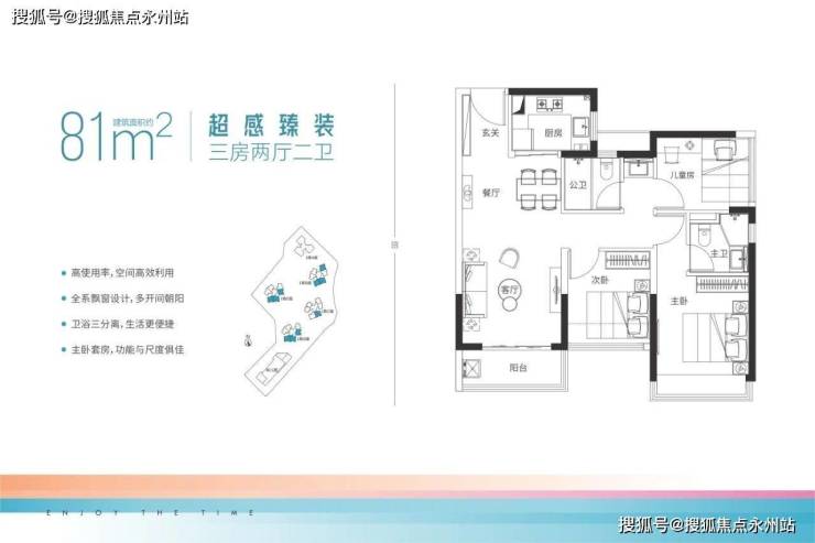 约81㎡三房两卫(1栋B座01/02/05户型、1栋C座01户型、1栋D/E座01/02/06户型)竖厅格局,餐客一体,动静分区结构,客厅开间约3.2米,主卧开间约3米,两个次卧开间约2.7米,约2.3米,阳台有东南、东北和南朝向。