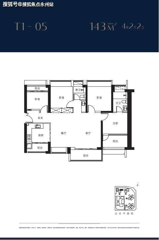 1栋2栋05户型143㎡4房2卫(单价7.6万-7.9万总价1086万-1130万)