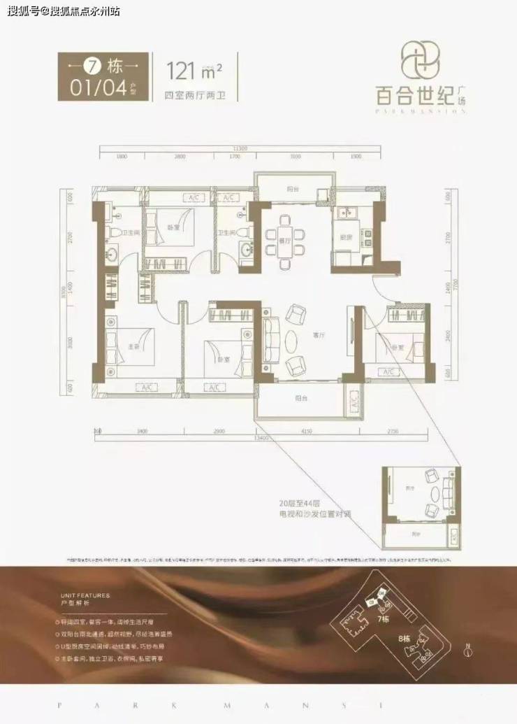 7栋121㎡的4房2厅2卫,设计的是竖厅南北通透格局,双阳台设计,客厅4.15米开间,4个卧室分别做到了3.4/2.9米/2.8米/2.75米的宽度,U型厨房,全屋飘窗设计。