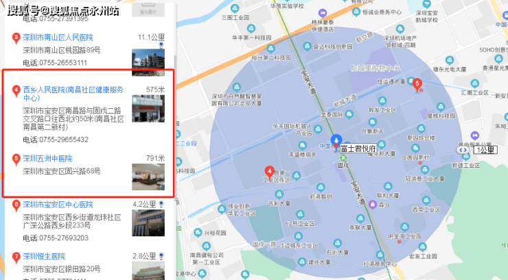 项目1公里直径范围内有西乡人民医院(南昌社区健康服务中心)、深圳五洲中医院2家公里医院,步行至西乡人民医院(南昌社区健康服务中心)约770米,耗时约11分钟;步行至深圳五洲中医院约1.1公里,耗时16分钟。