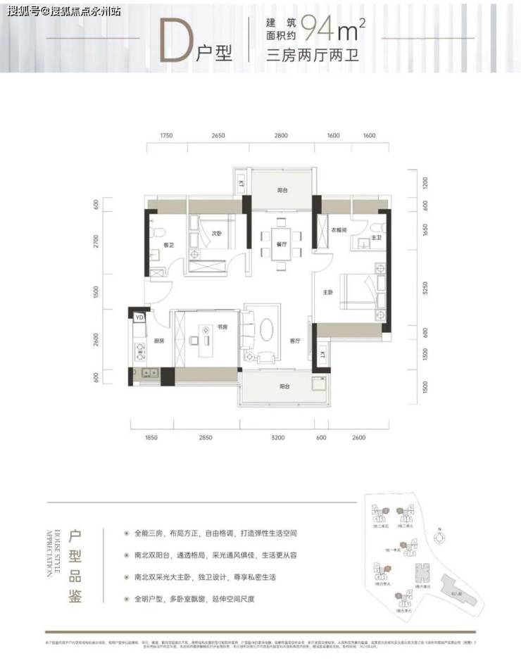 建面约94㎡的户型同样是3房2厅2卫,空间更加阔绰。