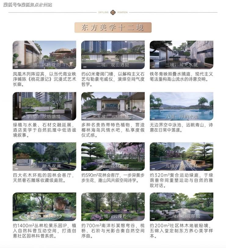 项目社区以“东方美学十二境”为主题,融合山水意趣与森林意境,打造多层次景观体系: