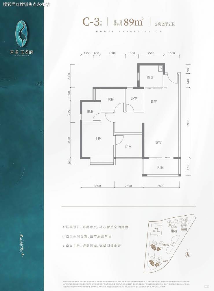 其他同面积户型:C2 户型(2 栋 A/B 座 02-03 户型):客厅开间3.5米,得房率 90.9%,东南朝向直面河景。