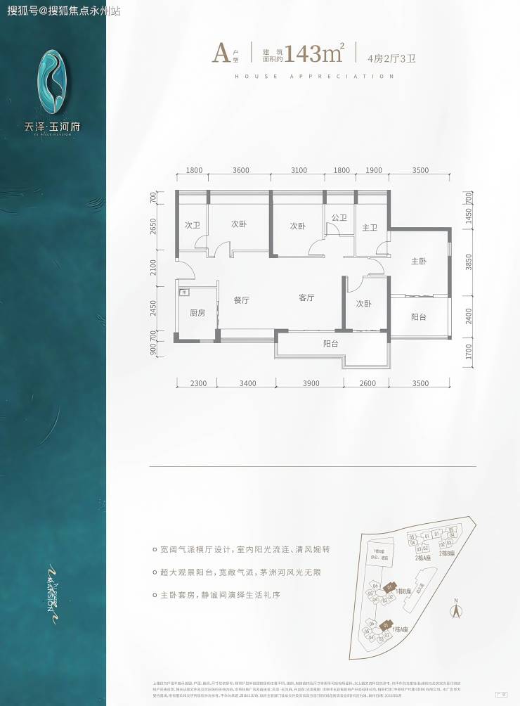 143㎡四房三卫:横厅南北通透,客餐厅开间7.3米,双主卧套房设计,超大观景阳台6.5米长。