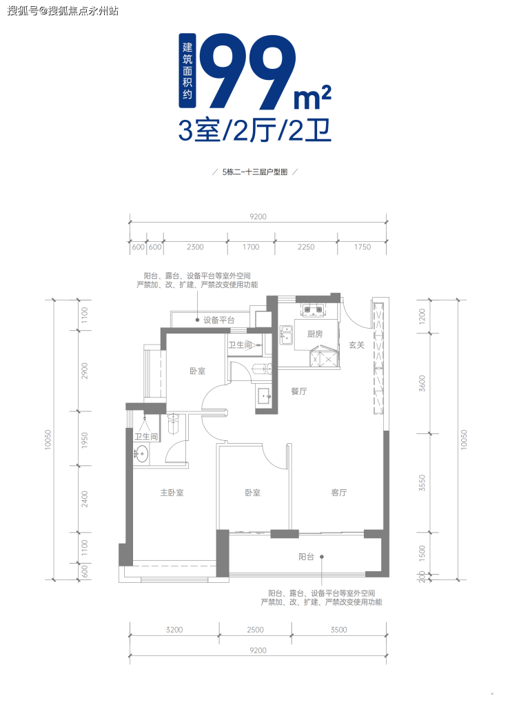 99㎡的3房2厅2卫,设计的是竖厅格局,客厅3.5米开间,三开间朝南,客厅连接次卧出6米长的大阳台,3个卧室分别做到了主卧15.9㎡/次卧8.2㎡/次卧8㎡(包含墙体飘窗),得房率:77.43%(不含赠送),阳台朝西南或东南向。