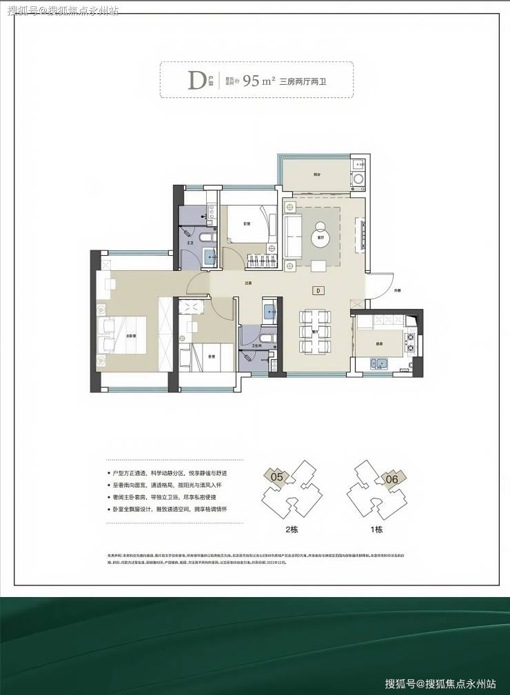 95㎡的3房2厅2卫,设计的是竖厅南北通透格局,客厅3.5米开间,五开间朝南,3个卧室分别做到了3.3米/2.5米/2.5米的宽度,主卧南北通透设计,U型厨房,公卫三段式分离,得房率:80.07%(不含赠送),阳台主朝西北或东北向。