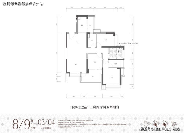 约109-112㎡三房两卫(8/9栋03/04户型)经典竖厅格局,餐客一体设计,带独立生活阳台,奇数层客厅正出景观阳台,偶数层客厅侧出景观阳台,西南朝向;奇偶层主卧与主卧卫生间之间的镂空地方需要改造,获取一个房间。
