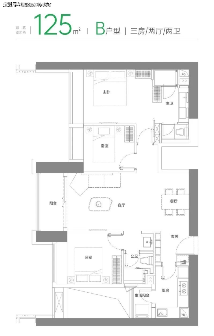 125平三房两卫B户型这个户型有99套,总体和118平格局类似,放大了部分功能区的面积,且增加了一个生活阳台。